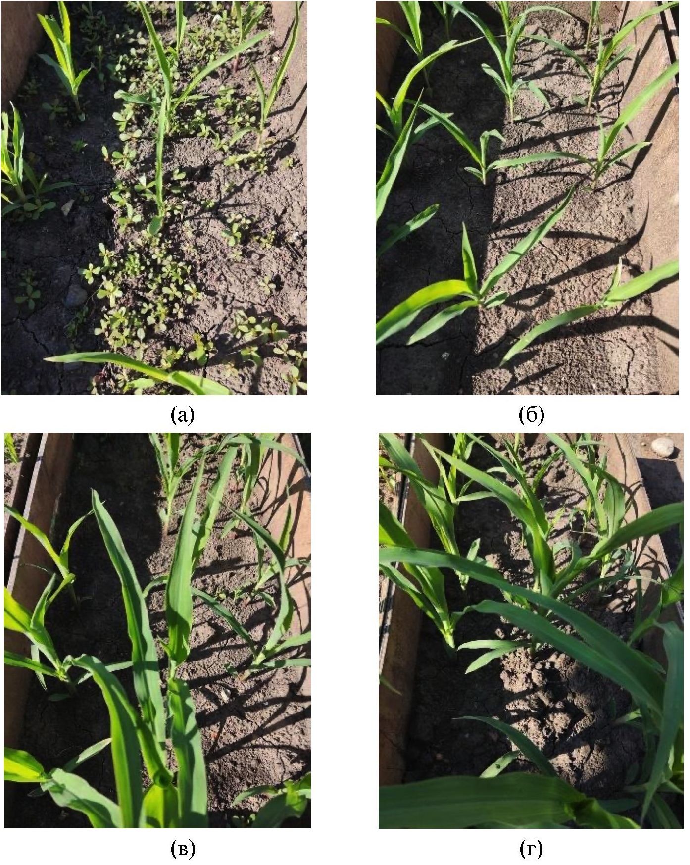 Появление сорной растительности (21-й день). После перемещения образцов на улицу (рис. 3) началось прорастание сорняков в образцах (а) и (б): образец (а) – необработанная почва: на поверхности активно росла сорная растительность, что затрудняло развитие кукурузы. Сорняки конкурировали за питательные вещества и свет, что соответствовало данным [6], где указано, что отсутствие обработки приводит к доминированию сорной растительности; образец (б) – парообработанная почва: количество сорняков меньше, однако их присутствие все еще заметно; образцы (в) и (г) – микроволновая обработка: сорняков не обнаружено, что свидетельствует о высокой эффективности метода в уничтожении семян сорняков.
