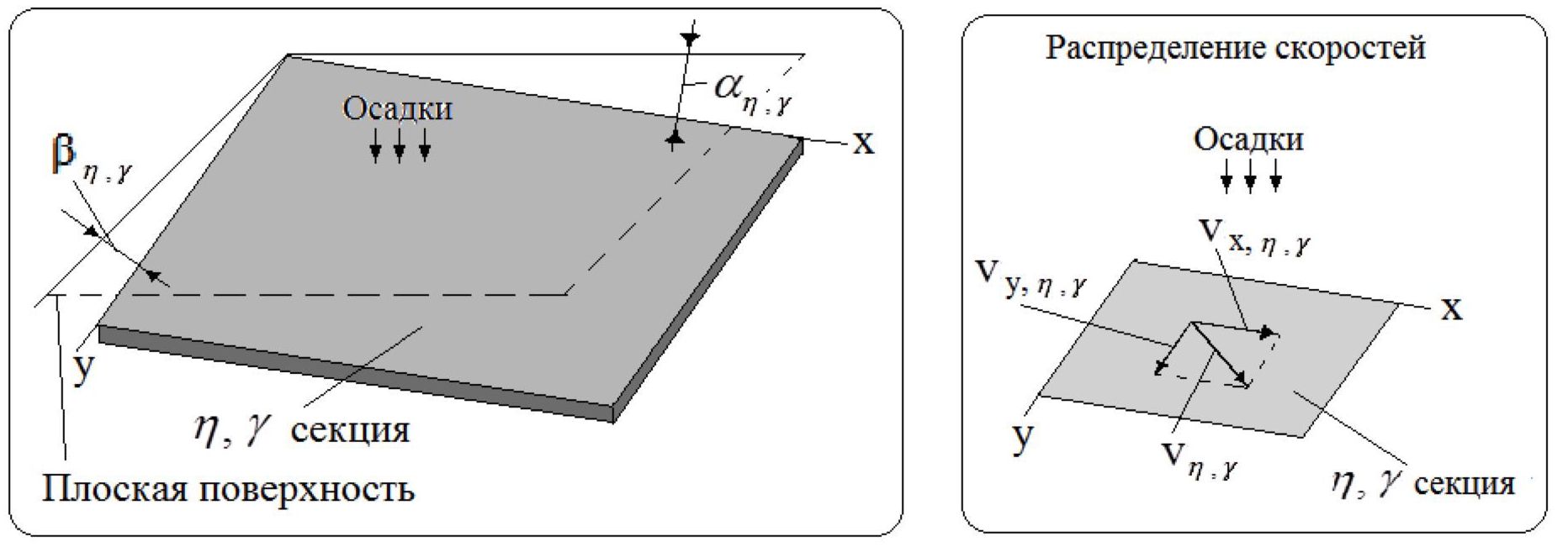 Рассмотрим моделирование гидролитосферных процессов при выпадении осадков на наклонную поверхность, показанную на рисунке 2. При этом рассмотрим вариант, когда каждая секция имеет свои углы наклонов по пространственным координатам и ( и ) относительно ровной плоской поверхности (рис. 2).