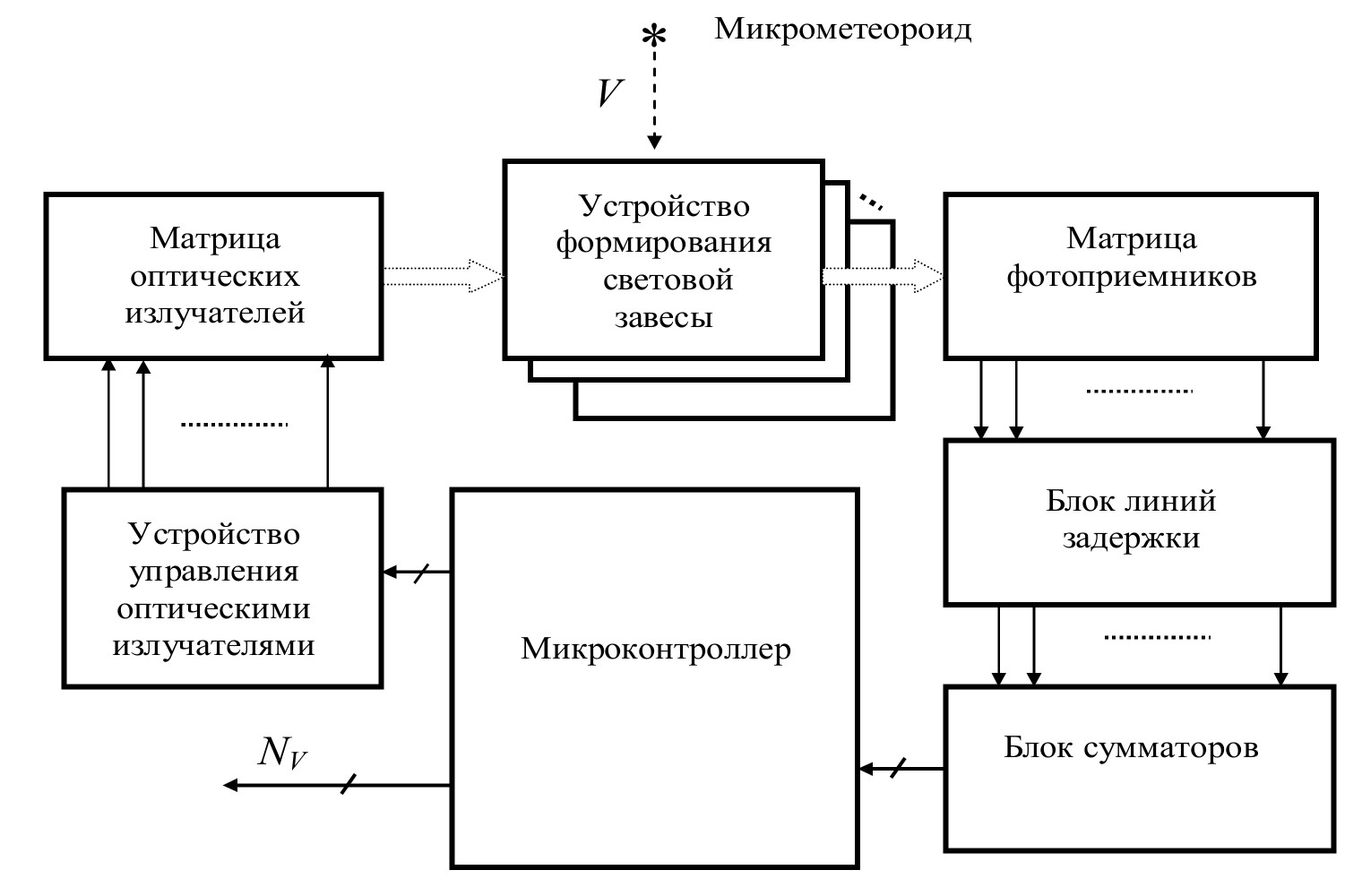 Матрица оптических излучателей состоит из светодиодов с фокусирующей линзой, создающей световую плоскость, которая принимается фотоприемной матрицей. Микрометеороидное тело, пересекая световую завесу, вызывает изменение сигнала на чувствительном элементе, что приводит к изменению напряжения на выходе сумматора, вызванному отличающимся уровнем сигналов на входе сумматора, поступающих с выходов фотоприемников и линии задержки. Количество завес может варьироваться от одной до n.