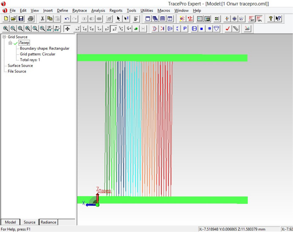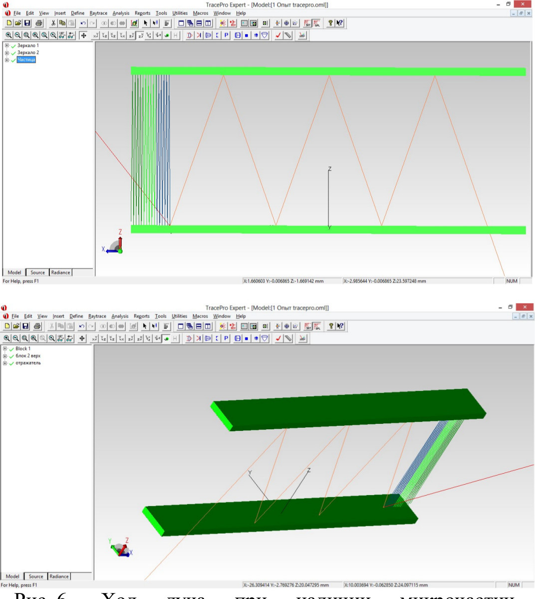 Для реализации реального случая на поверхности одного из зеркал, на пути луча, была смоделирована частица пыли размером 2 мкм (больше ширины пучка). Полученная модель представлена на рис. 6.