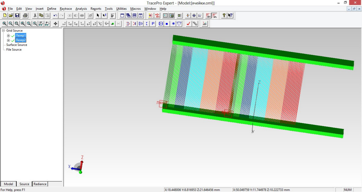 Модифицированная система предоставляет возможность увеличить данную область, используя ячеечную структуру формирования световой завесы. Основная идея ячейки заключается в том, что в крайних точках луча, которые еще можно зарегистрировать современной электронной компонентной базой, достаточно устанавливать приемное устройство и продолжать создание световой завесы с помощью дополнительных источников лазерного излучения. На рис. 4 представлена полученная модель хода луча.