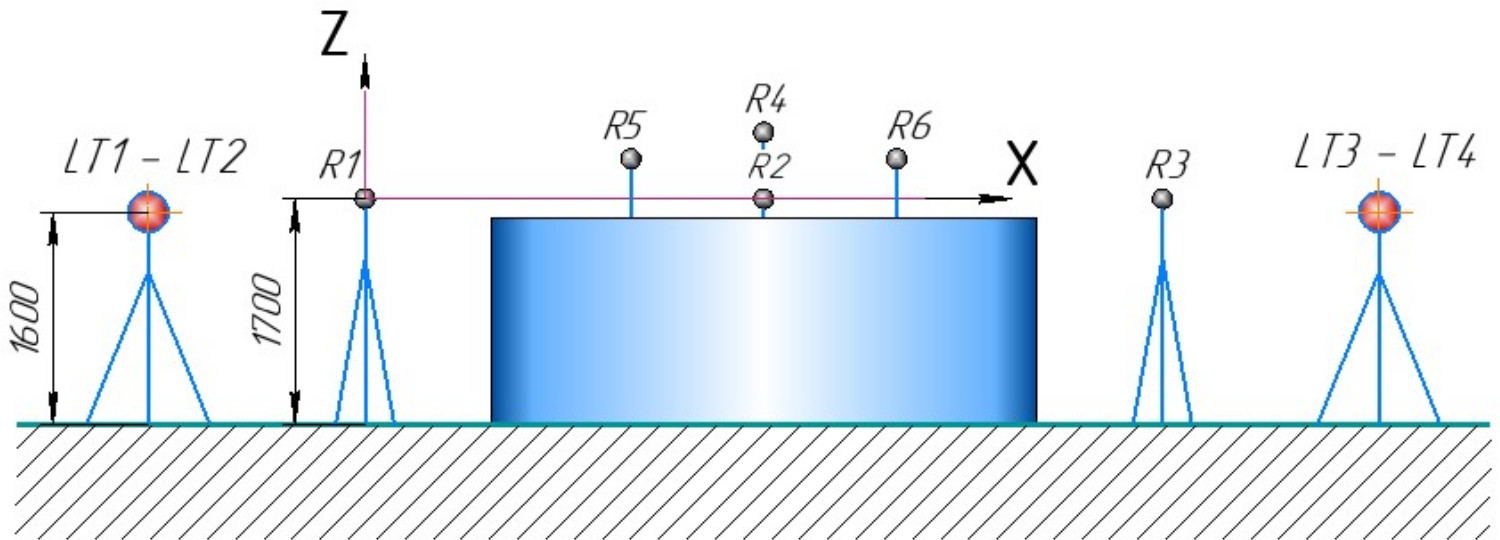 Расположение опорных точек Ri(xi; yi; zi) и стоянок трекера LTj(xj; yj; zj) приведено на общей схеме на рис. 6 и 7.