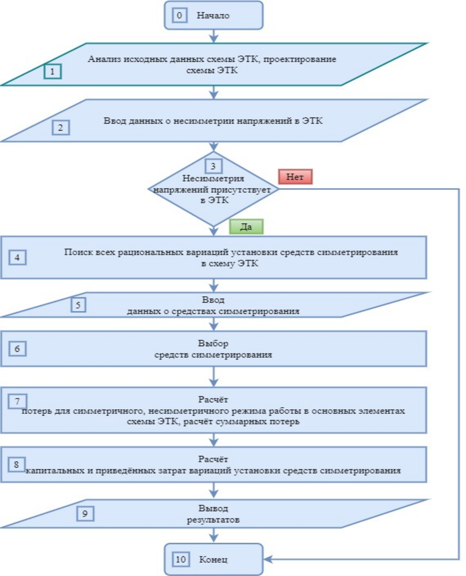 Программный алгоритм основан на методике расчета ЭТК с учетом использования средств симметрирования и мест их установки. Обобщенная блок-схема алгоритма расчета приведена на рис. 1. Подробный алгоритм расчета приведен в [25].