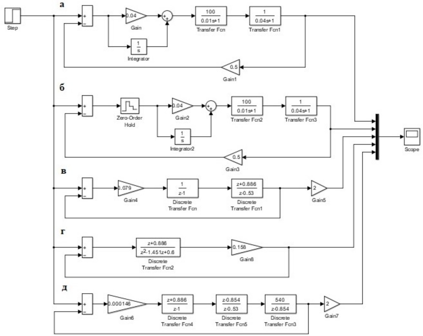Рис. 2. Схема модели САУ: а – аналоговая САУ; б – САУ с дискретным звеном Zero-order; в – САУ, представленная в форме Z-преобразования; г – замкнутая САУ в форме Z-преобразования; д – САУ, представленная в форме Z-преобразования с выделенным регулятором тока