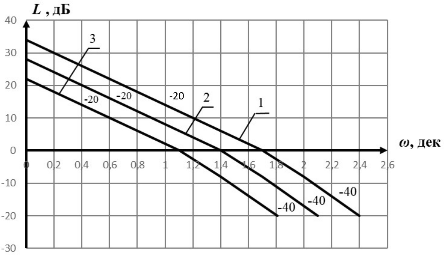 Рис. 6. Желаемая ЛАЧХ разомкнутой САУ, настроенной на технический оптимум: 1 – ЛАЧХ контура тока, 2 – ЛАЧХ контура скорости, 3 – ЛАЧХ контура положения.
