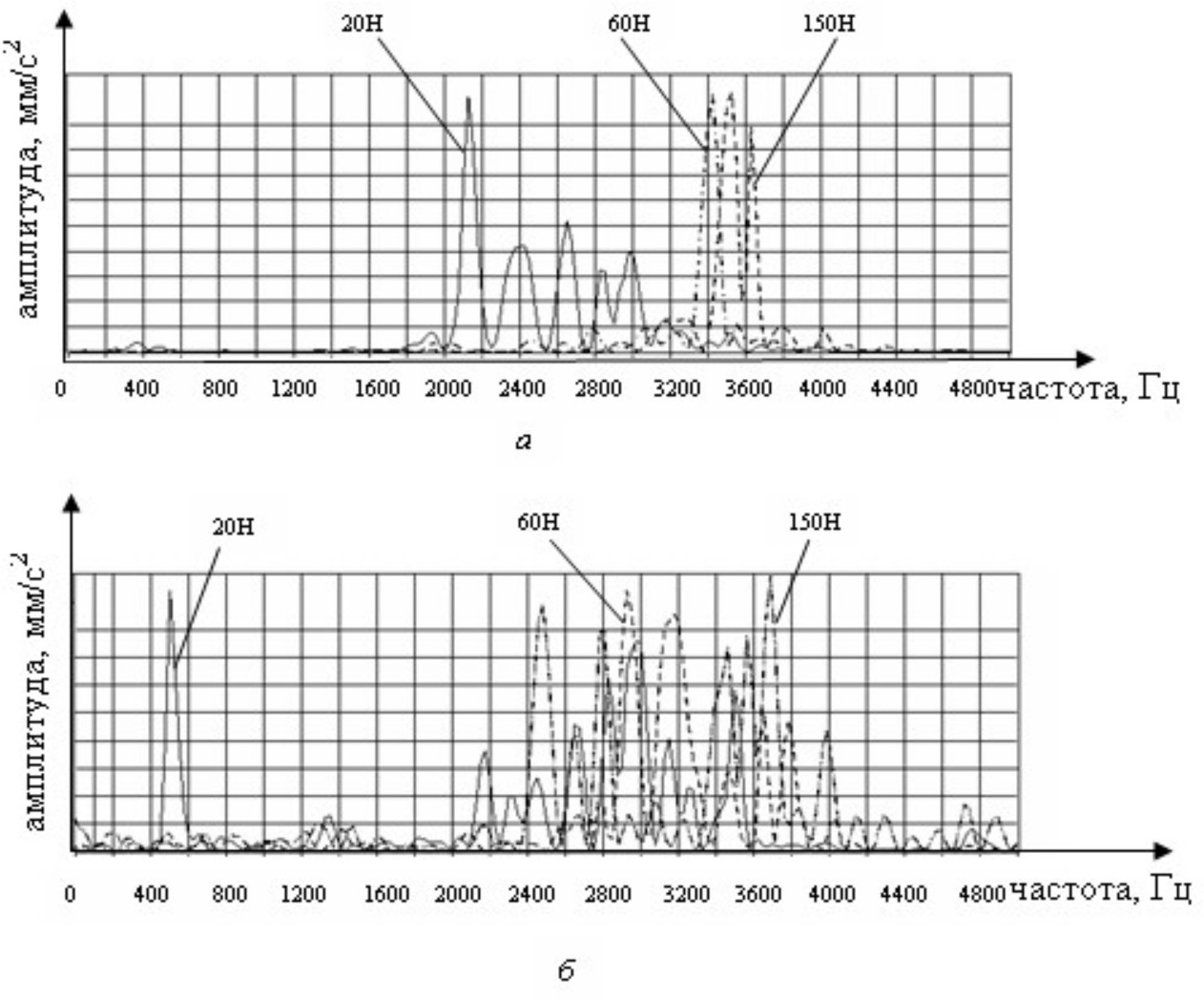 Для всех значений предварительного натяга были получены амплитудные спектры. Для значений преднатяга 20, 60, 150 Н на рис. 6, а приведены графики амплитудных спектров сигналов виброускорений нулевого канала, а на рис. 6, б – графики амплитудных спектров сигналов виброускорений первого канала.