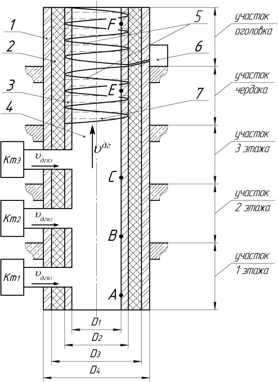 Рис. 1. Расчетная схема дымохода: 1 – кирпичная кладка; 2 – теплоизоляция (минеральная вата); 3 – стальная труба, через которую проходят дымовые газы 4; 5 – греющие кабели на участках оголовка и чердака соответственно; 6 – шкаф управления; 7 – бандаж; Кт1, Кт2, Кт3 – котлы на 1-м, 2-м и 3-м этажах соответственно; υдгк1, υдгк2, υдгк3 – скорости дымовых газов на входах в дымоход, формируемые котлами 1, 2 и 3 соответственно; υдг – скорость дымовых газов в дымоходе; D1, D2, D3, D4 – диаметры границ раздела сред и материалов слоев дымохода; A, B, C, E, F – принятые расчетные точки исследования