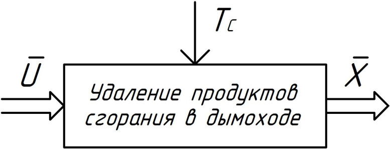 Поставленная задача технологического процесса удаления продуктов сгорания через трубу дымохода, где состояние ОУ будет определяться температурой внутренней поверхности трубы на характерных участках оголовка и чердака, целесообразно решить последовательно в два этапа. На первом – разработать математическое описание и выполнить исследования изменения температурного поля внутри дымохода при вариации тепловых мощностей и режимов работы котлов-колонок. На втором предлагается провести эксперименты, где регулирование и поддержание требуемой температуры в наиболее характерных сечениях F и E (см. рис. 1) будет обеспечиваться путем дополнительно установленных нагревательных элементов с соответствующими мощностями Q1 и Q2. Для реализации первого этапа процесс удаления продуктов сгорания в трубе дымохода как многомерный объект управления может быть представлен в виде структуры (рис. 2). Здесь выходные координаты обозначены вектором = [TF,TE]T , управляющее воздействие – вектором Ū = [Qк1, Qк2, Qк3 ]T, а возмущение – Tc.