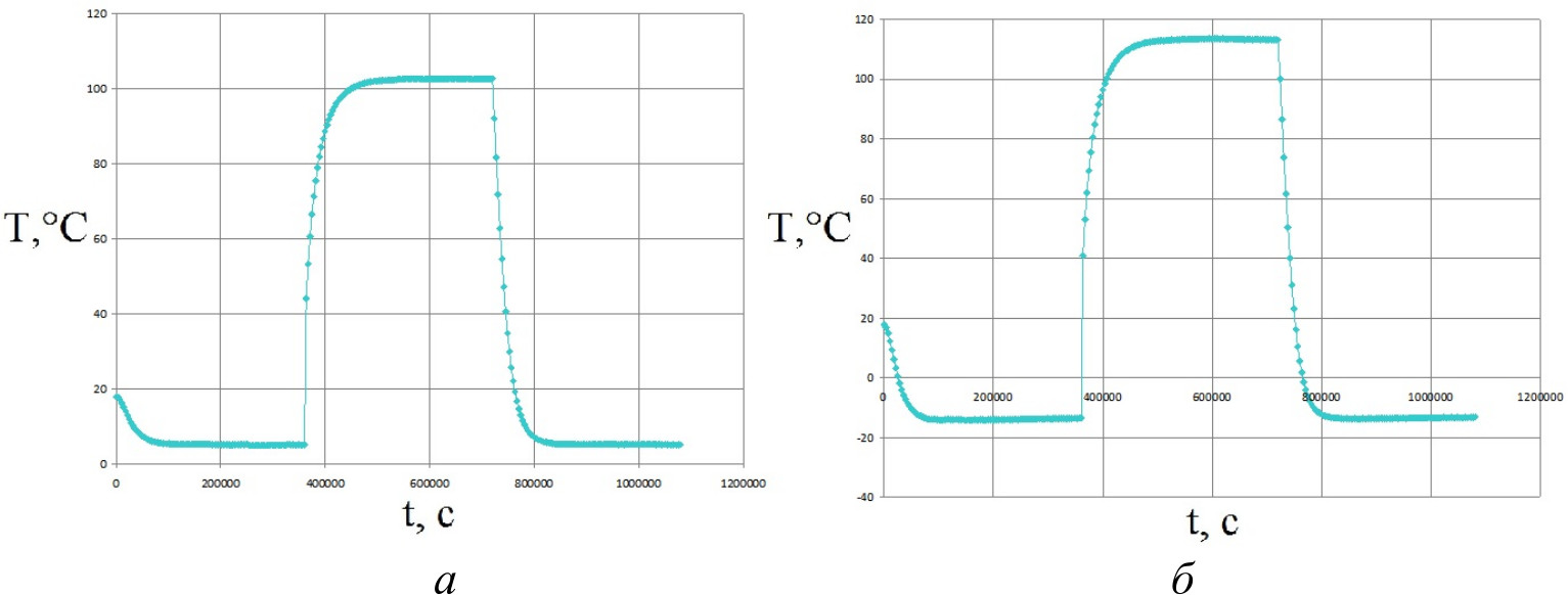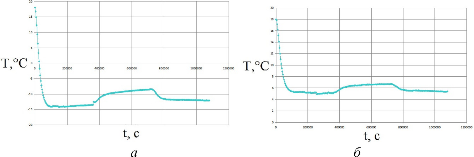 Рис. 7. Процессы изменения температуры на участках чердака (а) и оголовка (б) при работе соответствующих греющих кабелей