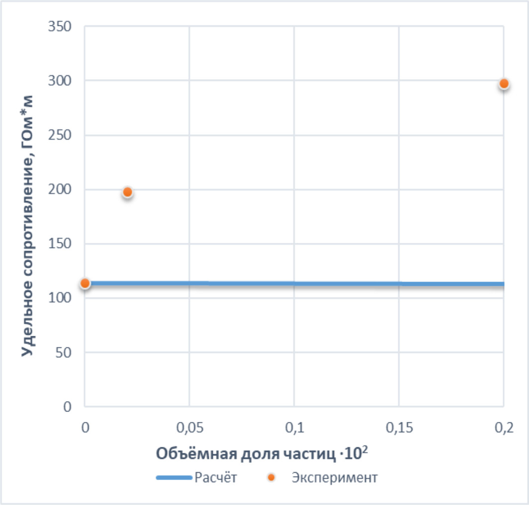 Более примечательным является изменение удельного сопротивления смесей. Измеренная зависимость удельного сопротивления наномасла от объемной доли включений явно противоречит расчету, в котором зависимость удельного сопротивления от концентрации частиц незначительна.