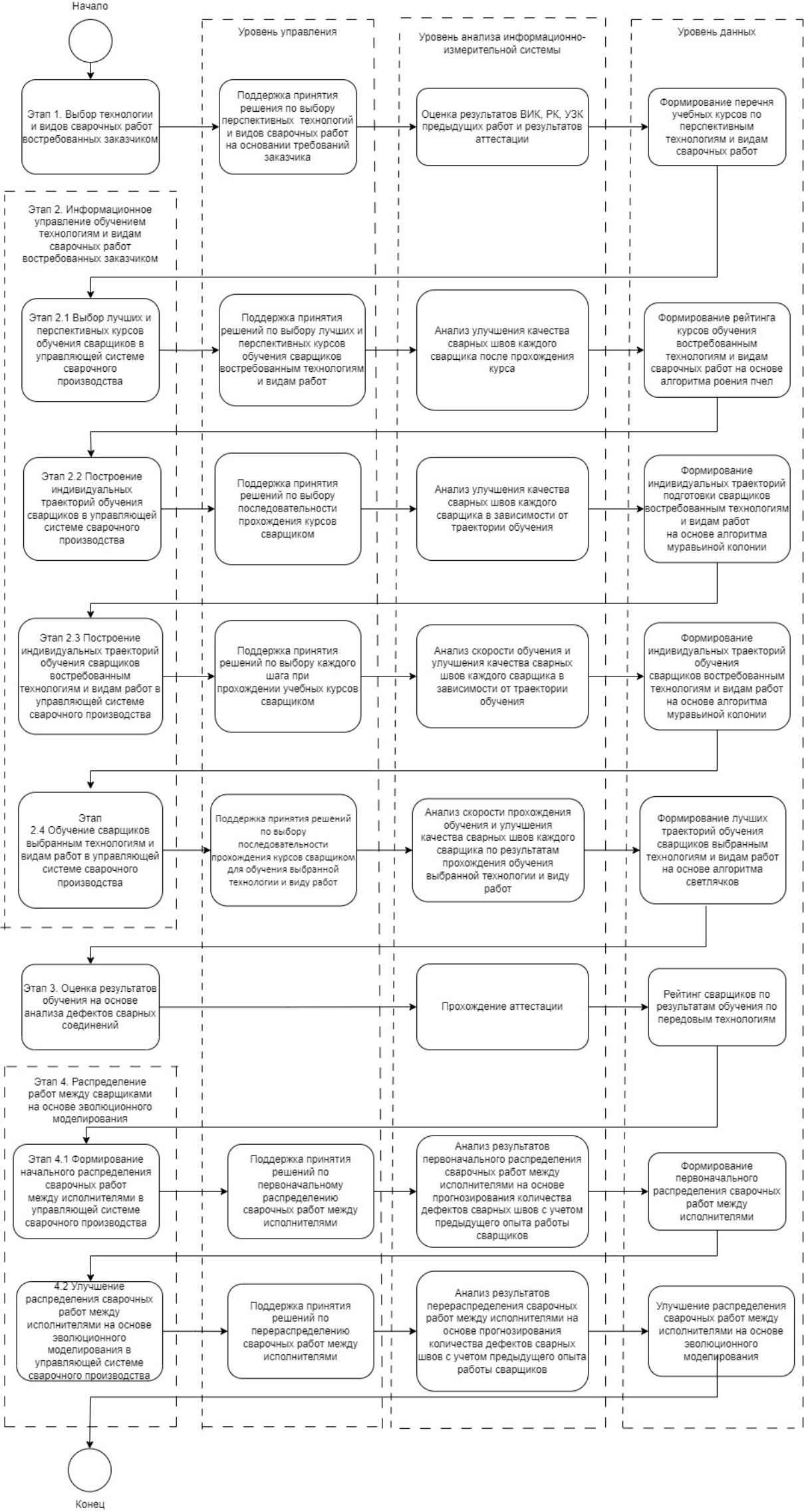 Организация процессов обучения сварщиков, оценка их опыта и качества выполнения работ, назначение сварщиков на работы непосредственно связаны с принятием управленческих решений [1–5]. Перечисленные задачи могут решаться различными способами. Однако большинство способов, основанных на применении опыта руководителей сварочных производств, связаны с субъективными оценками работ и не позволяют объективно оценить весь опыт работы и квалификацию сварщика из-за необходимости обработки большого количества данных обо всех работах и обучении сварщиков. Одним из наиболее перспективных подходов к решению задач повышения эффективности процессов обучения сварщиков, объективной и непредвзятой оценки их опыта и качества выполнения работ, распределения работ между сварщиками является создание информационно-измерительной и управляющей системы сварочного производства. Информационно-измерительный уровень системы на основе методов и средств визуально-измерительного (ВИК), рентгенографического (РК) и ультразвукового контроля (УЗК) с автоматизацией анализа каждого сварного шва обеспечит возможность объективной непредвзятой оценки опыта работы и результатов обучения каждого сварщика на основе автоматического анализа большого объема данных. Управляющий уровень системы предназначен для повышения эффективности процессов обучения сварщиков на основе алгоритмов роевого интеллекта и распределения работ между исполнителями на основе эволюционного моделирования [6–8].