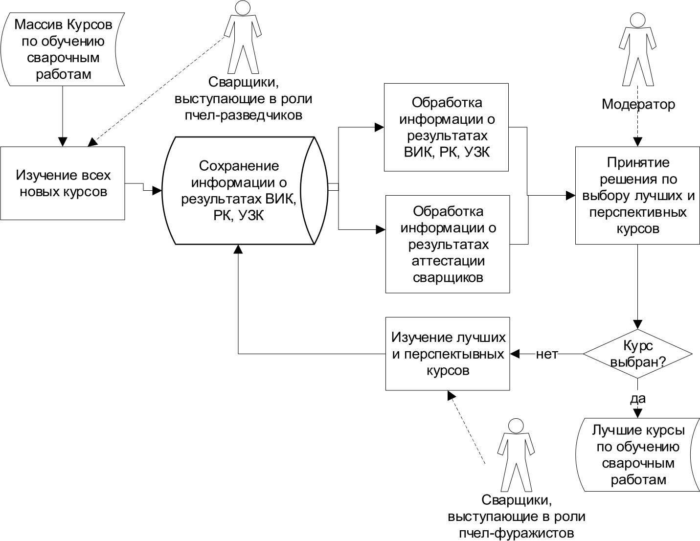 С целью отбора курсов сварщики, выступающие в представленном алгоритме в роли «пчел-разведчиков», проходят все имеющиеся по данному виду сварочных работ курсы. После обработки информации о результатах работы сварщиков, прошедших все курсы, в информационно-измерительной системе выполняется анализ дефектов сварных швов, выполненных каждым сварщиком, на основании ВИК, РК, УЗК. Результаты анализа используются для поддержки принятия решений о выборе лучших и перспективных курсов. С целью построения рейтинга отобранных на первом этапе курсов к их изучению приступают сварщики, выполняющие в представленном алгоритме роль «пчел-фуражистов». Принятие решения о выборе лучшего и перспективного курса происходит на основании построенного рейтинга курсов, прохождение которых позволит всем оставшимся сварщикам за минимальное время освоить востребованные технологии и виды сварочных работ и снизить количество дефектов в своей работе.