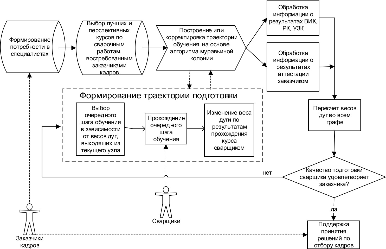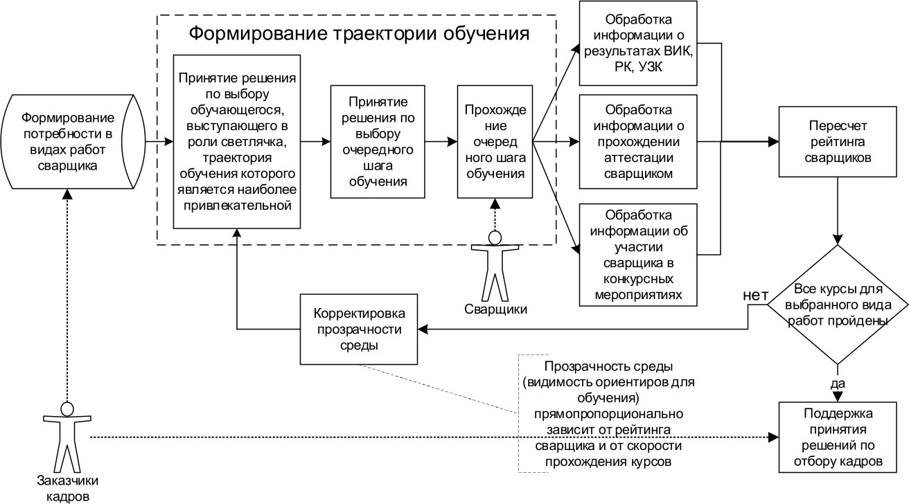 Сварщики последовательно выбирают курсы из предложенного перечня. По итогам изучения курса сварщики проходят аттестацию, результаты которой отражаются в информационно-измерительной системе сварочного производства средствами программного комплекса WELDINGTRAINING [14]. Последовательность прохождения курсов сварщиками запоминается и сохраняется. Чем меньше количество дефектов сварных швов, зафиксированных в ИИиУС с использованием ВИК, РК, УЗК после изучения курса, тем сильнее стремление сварщиков, не прошедших обучение, повысить свою квалификацию для максимального соответствия требованиям заказчика. Траектории обучения сварщиков, закончивших изучение всех курсов по выбранной технологии или виду работ за наименьшее время, быстро становятся самыми заметными, привлекая внимание наибольшего числа сварщиков. Менее используемые траектории обучения постепенно пропадают.