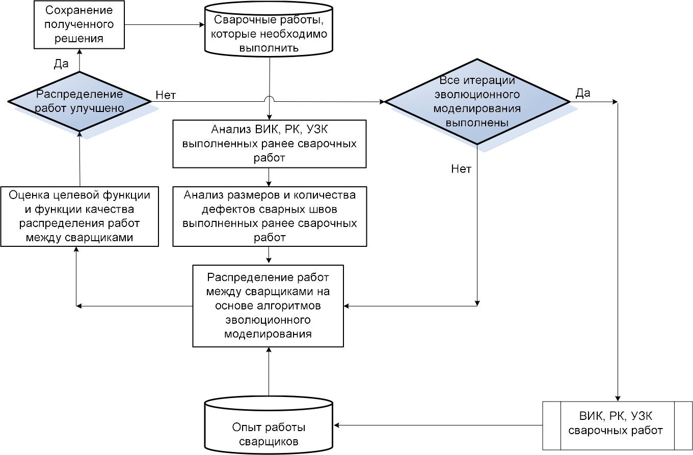 Структурная схема процесса распределения работ между сварщиками на основе эволюционного моделирования представлена на рис. 5. Для решения задач распределения работ между сварщиками разработаны алгоритмы повышения эффективности управления на основе эволюционного моделирования, обеспечивающие возможность реализации основных принципов и особенностей предложенной концепции.