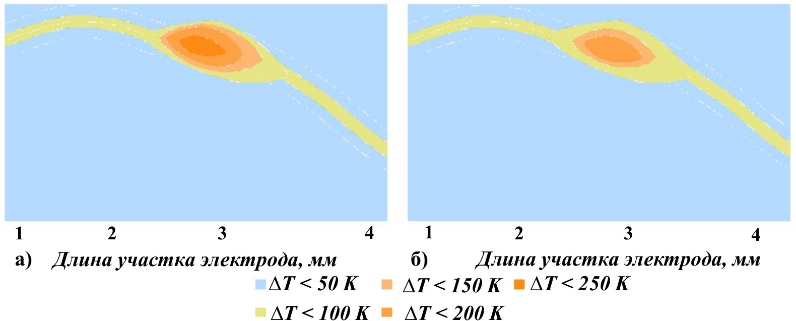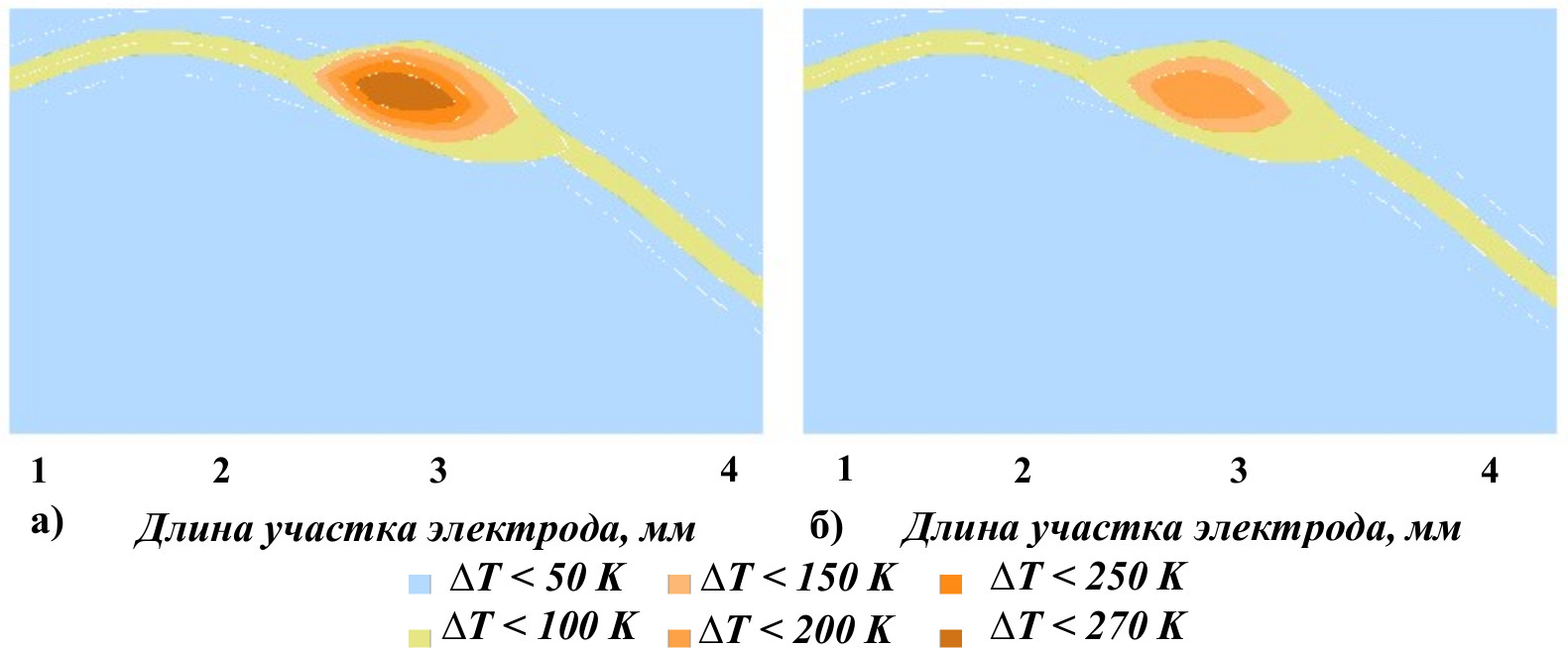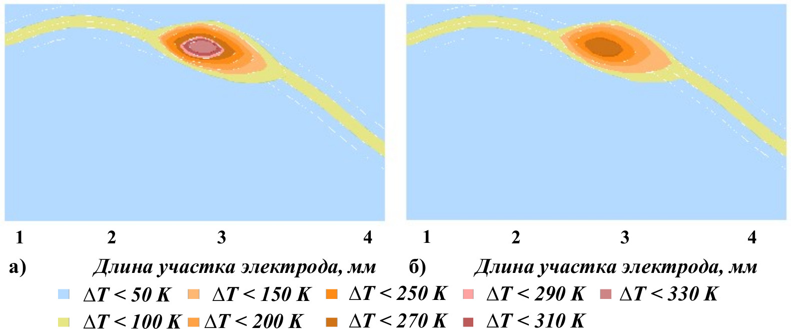 Рис. 13. Отображение изменения температуры медного электрода плазматрона при движении приэлектродного участка плазмы при % (а), % (б)