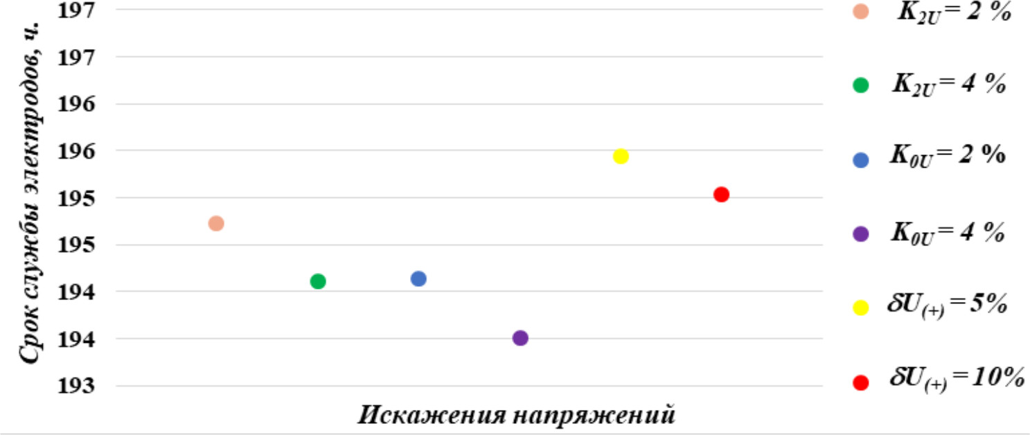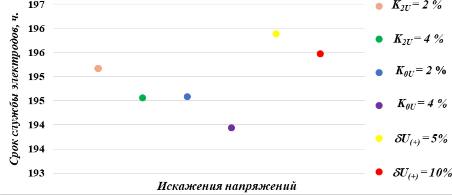 Проведенные исследования доказали влияние искажения напряжений на срок службы электродов плазменных установок при использовании магнитно-волнового сканирования. Установлено, что максимальная величина изменения срока службы наблюдается для электрода с материалом изготовления – медь при % и составляет %.