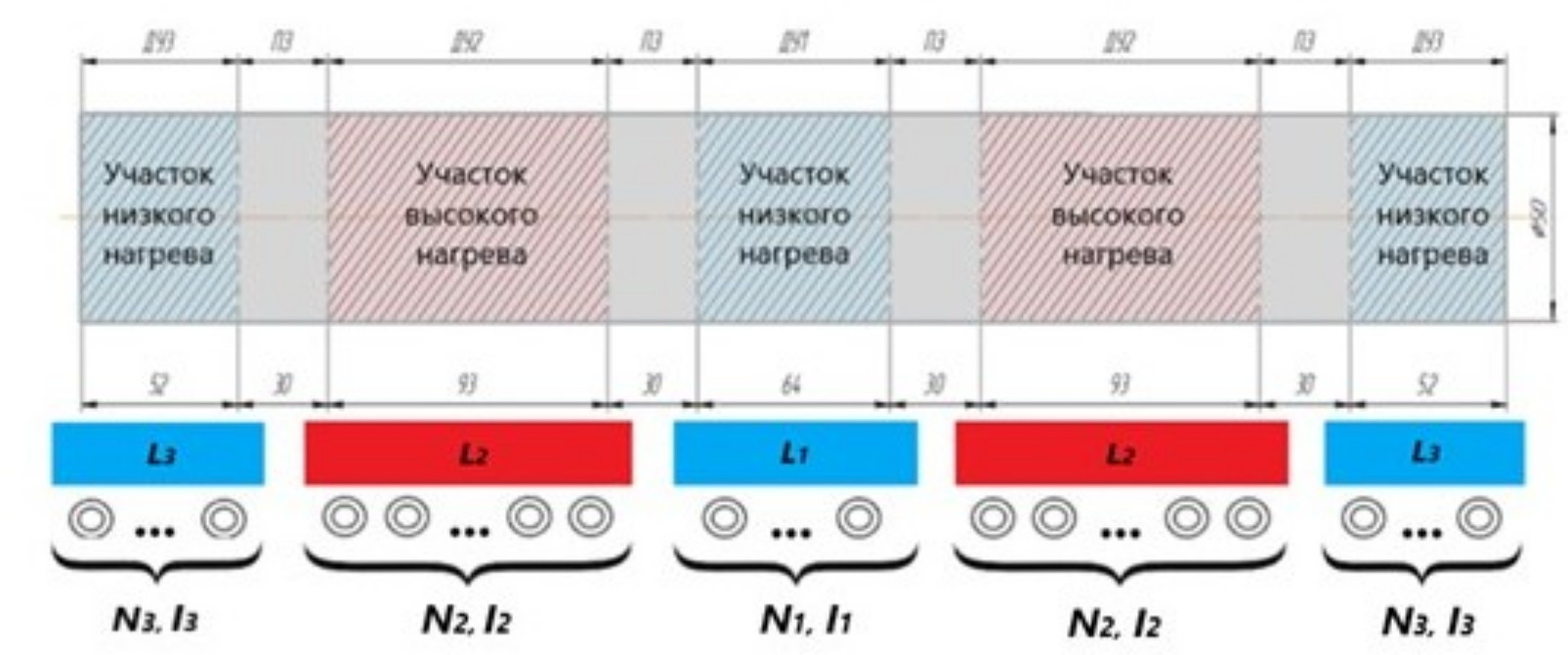 Для достижения неравномерного температурного профиля, изображенного на рис. 2, необходимо спроектировать зонную ИНУ автономно управляемыми секциями, каждая из которых характеризуется определенным набором конструктивных и режимных параметров (рис. 3).