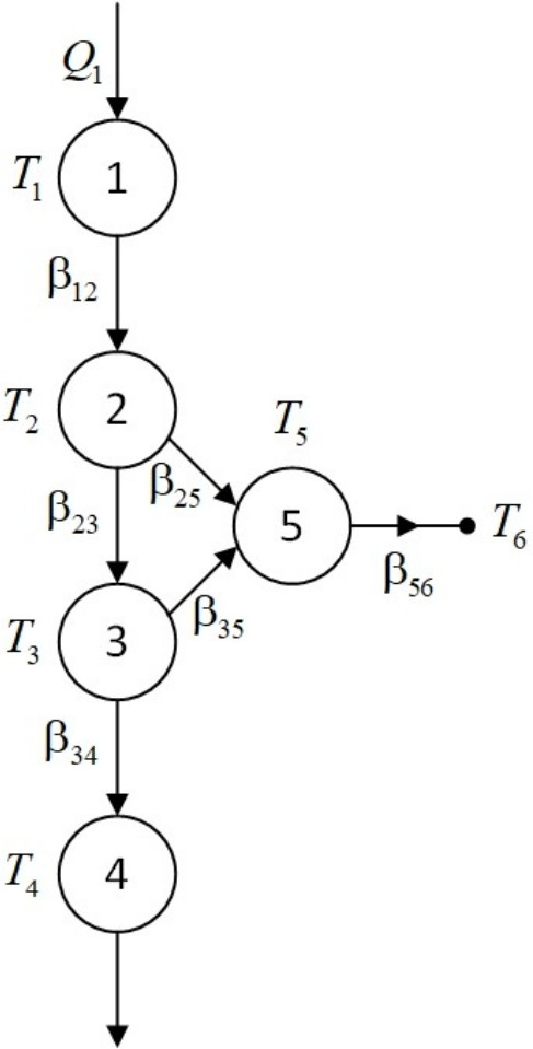 Теплообменный аппарат. Функция теплообменника - обмен тепла между греющим и нагреваемым теплоносителями. Теплоносители не взаимодействуют напрямую друг с другом, они передают тепло стенке, разделяющей потоки. Эксперименты показали, что повысить точность модели теплообменника позволяет представление стенки, разделяющей потоки, в виде двух взаимодействующих тепловых масс, обменивающихся энергией друг с другом и с внешней поверхностью, которая отдает тепло вовне. Тепловые массы модели теплообменника и тепловые потоки между ними изображены на рис. 3. Привнесение энергии в систему происходит через первую тепловую массу (объем греющего теплоносителя), а отток - через четвертую (объем нагреваемого теплоносителя) и пятую (внешнюю поверхность теплообменника, взаимодействующую с внешней средой). В модели теплообменника наблюдается полная аналогия с моделью котла: распределение выходных потоков зависит от КПД теплообменника, окружающая среда выступает тепловой массой с бесконечно большой теплоемкостью.