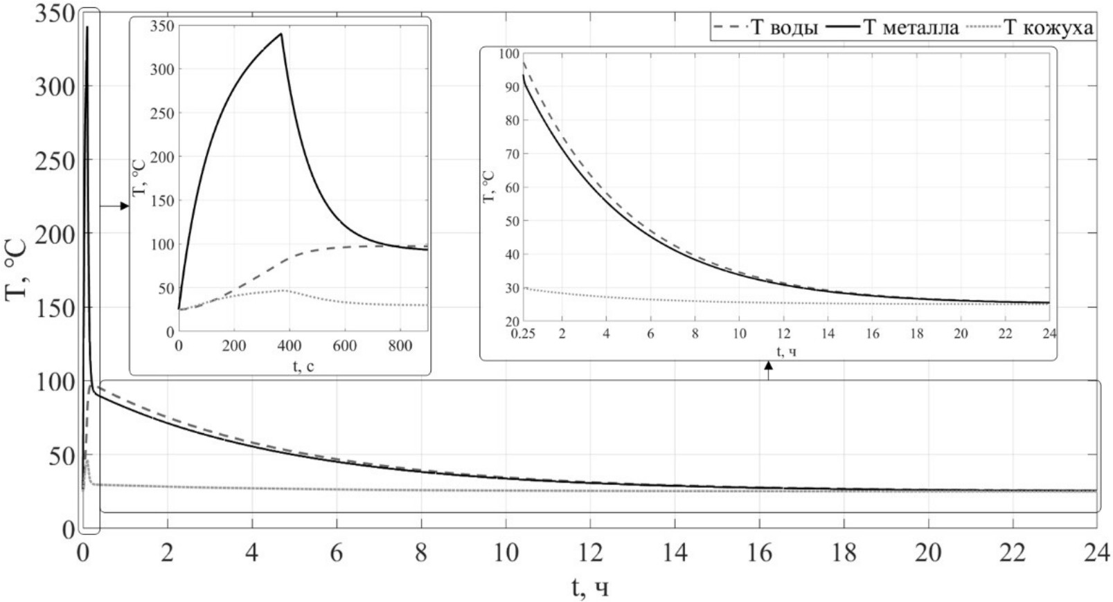 При включенной горелке быстрее всего нагревался металл поверхностей нагрева котла, теплоноситель и кожух нагревались медленнее, после отключения горелки температура металла достаточно быстро снижается из-за постоянного теплообмена с теплоемким теплоносителем. После 800 с температура металла становится меньше температуры теплоносителя. Видно, что теплоноситель постепенно остывает, взаимодействуя с остывающим металлом поверхностей нагрева, которые, в свою очередь, остывают от оттока тепла к кожуху котла. Кожух котла взаимодействует с внешней средой - воздухом внутри котельной с температурой 25 °C.