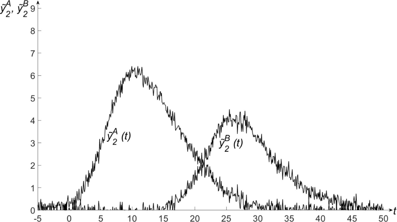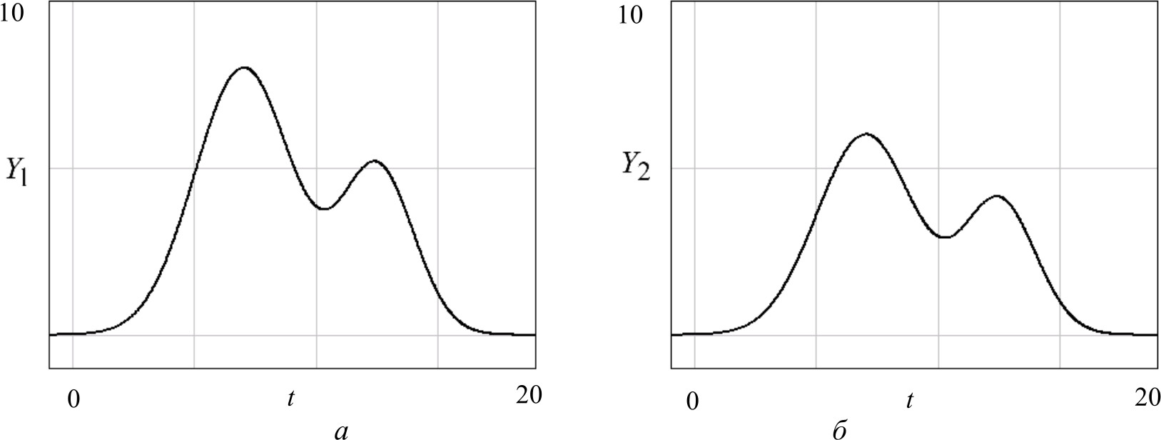 Рис. 4. Исходные сигналы первого и второго детекторов y1(t) и y2(t) при разрешении W=0.65