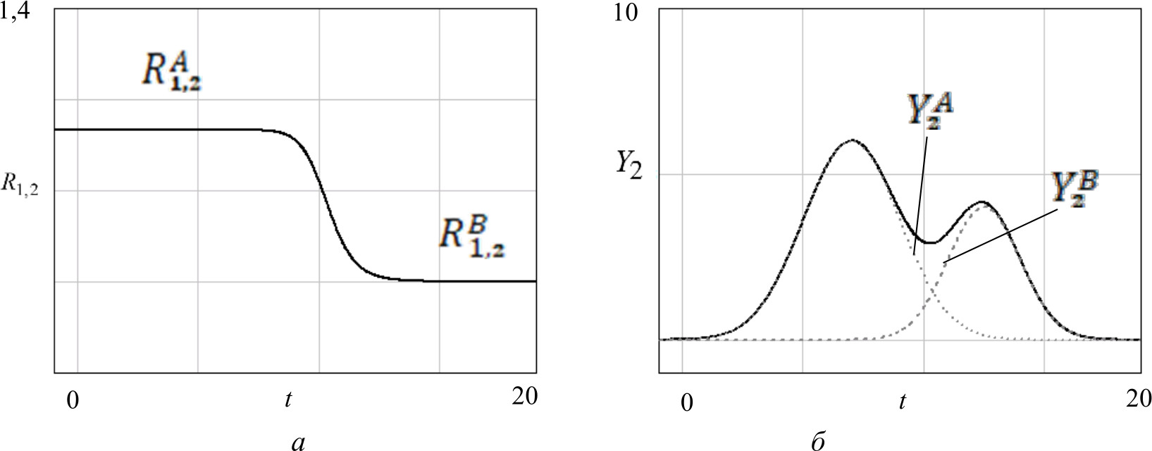 Рис. 2. Разделение сигналов второго детектора: а – отношение сигналов Y1 к Y2; б – исходный сигнал и разделенные компоненты ,
