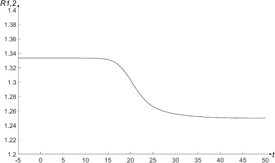 Более интересный результат дает подход, основанный на аппроксимации отношения некоторой аналитической зависимостью. Анализ характера изменения во времени позволяет в качестве такой зависимости выбрать функцию тангенс гиперболический [13] в виде