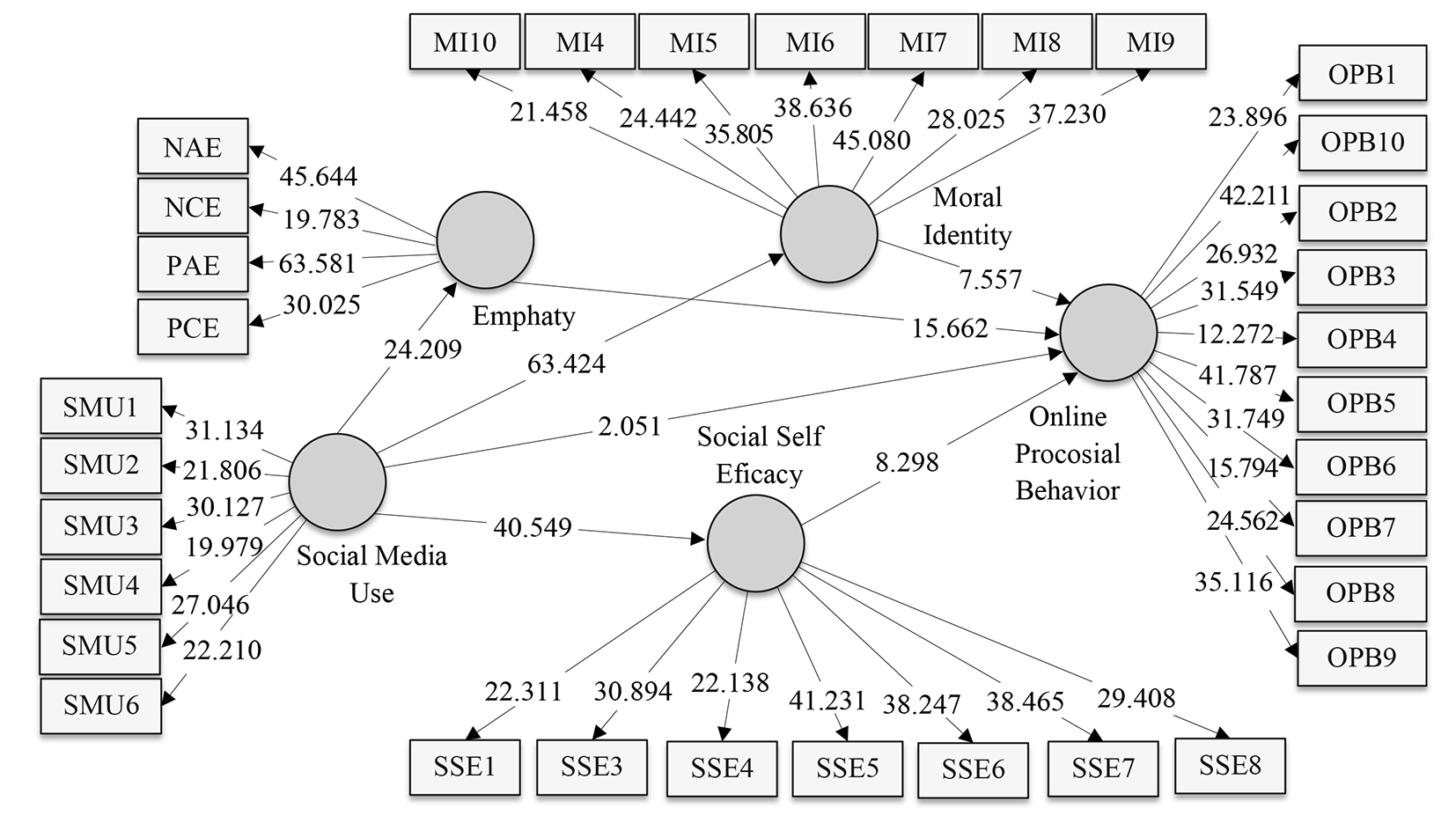 The modified running model is shown in Figure 3. Figure 3 shows that all items have factor loading scores above 0.70 and are declared valid. Thus, the number of each validated questionnaire item is 6 social media use items, 20 empathy items (there are 5 items in each dimension), 7 moral identity items, 7 social self-efficacy items, and 10 online prosocial behaviour items.