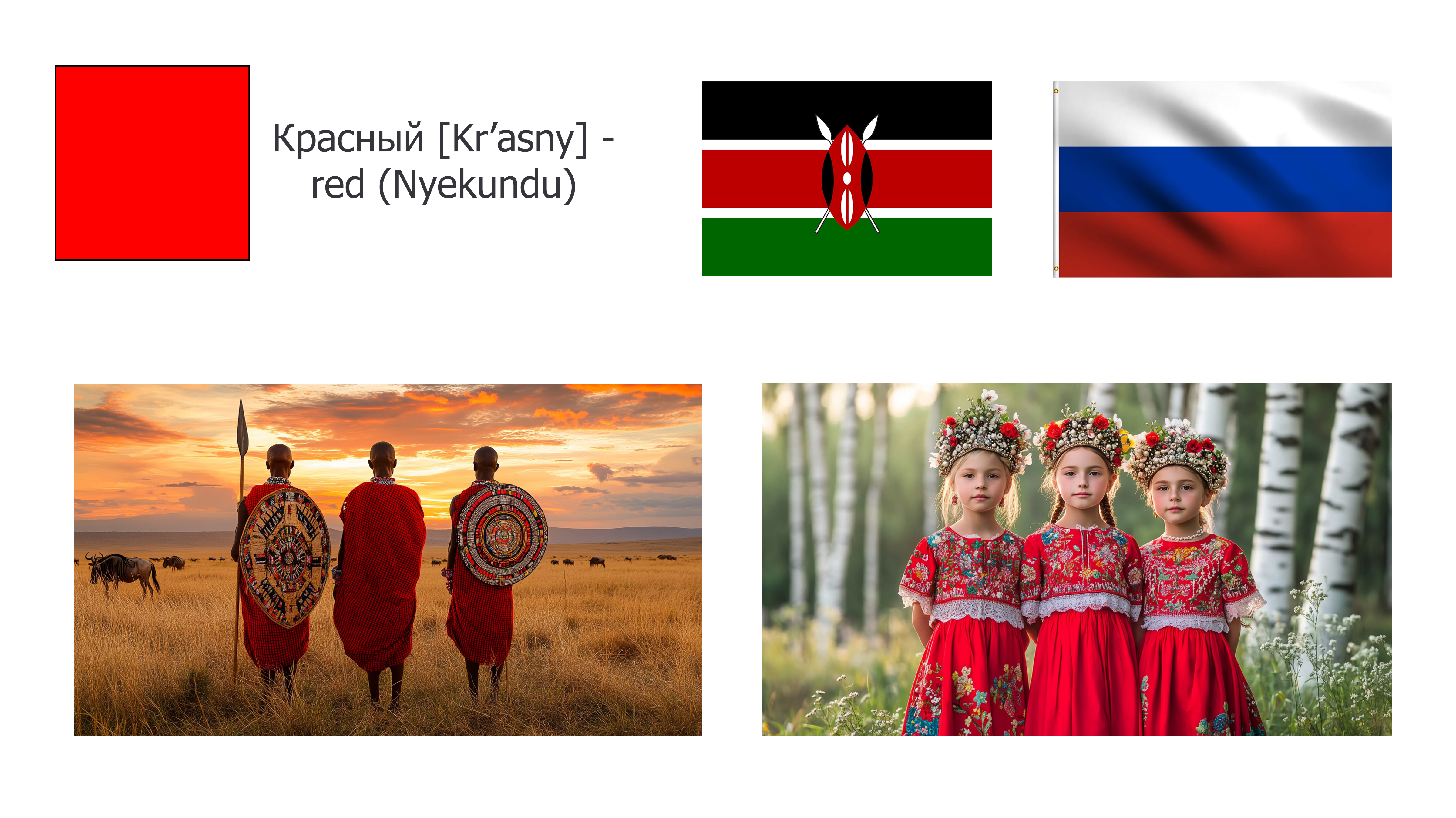 Фрагмент занятия, посвященного изучению цветовых прилагательных в рамках дисциплины «Русский язык как иностранный», доказывает повышение эффективности освоения темы с использованием кросскультурного материала. Рекомендуется использовать ресурс языка-посредника, задействовать зрительный канал восприятия обучающихся, предлагая их вниманию и рецепции иллюстрации, на которых лексема, обозначающая красный цвет, объективируется контекстом через сопоставление изображения кенийской и российской одежды и национальной государственной атрибутики ‒ флагов (рис. 2).