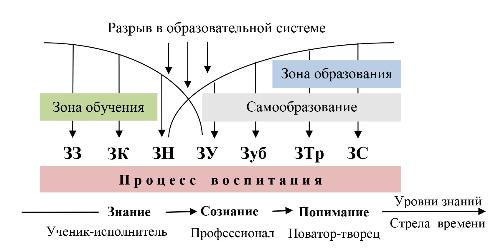 При наложении дополненной нами системы знаний на ось, совпадающую со стрелой времени (поскольку формирование последующих уровней знаний без предыдущих невозможно) появляется возможность их группировки по зонам обучения и образования (рис. 1).