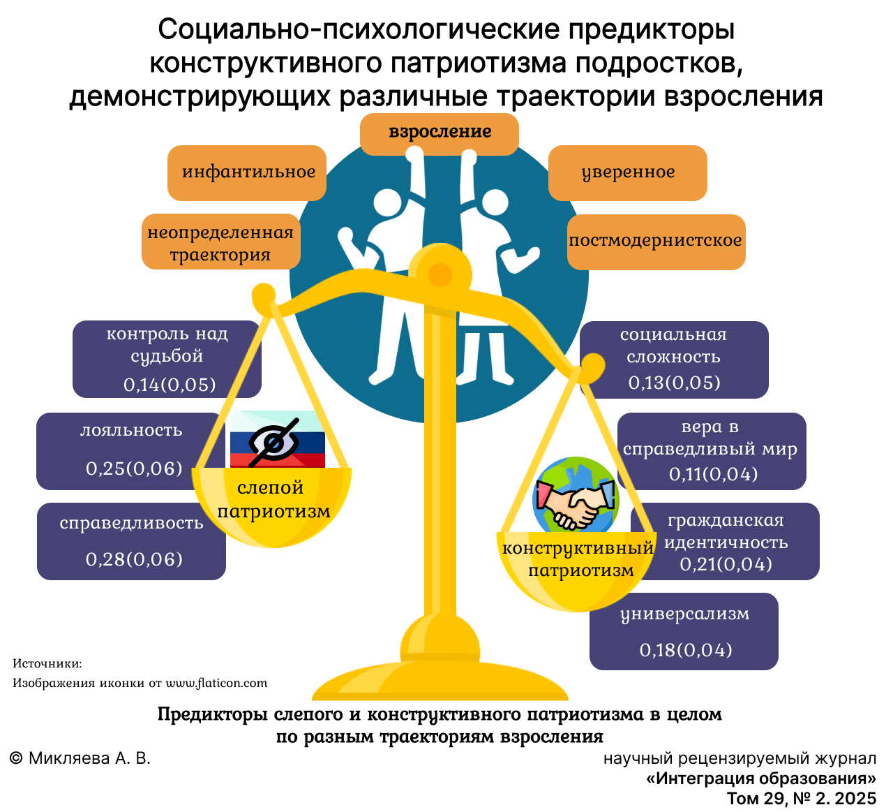 Валентность гражданской идентичности оказалась универсальным предиктором как конструктивного, так и слепого патриотизма во всех подгруппах (независимо от демонстрируемой траектории взросления). Конструктивный патриотизм поддерживается ценностями универсализма, веры в справедливый мир и убежденности в сложность устройства социального мира, а слепой патриотизм – моральным основанием «лояльность» и социальной аксиомой «контроль над судьбой». Социально-психологическими предикторами конструктивного патриотизма, дифференцирующими подгруппы подростков с различными траекториями взросления, выступили показатели морального выбора «уважение» и «справедливость», а также социальные аксиомы «награда за усилия» и «социальный цинизм». Для показателей слепого патриотизма подобных социально-психологических предикторов не обнаружено.