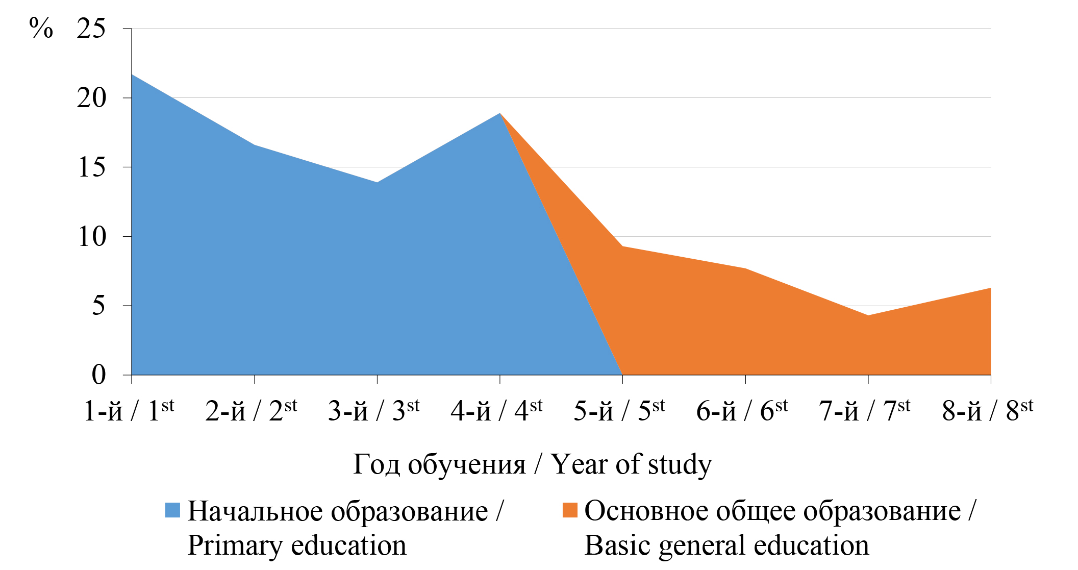 Анализ распределения достижений по годам обучения демонстрирует тренд на постепенное снижение внеучебной активности по мере перехода в старшие классы с временным подъемом перед переходом с одного уровня обучения на другой. Такая тенденция для средних учебных заведений отмечается российскими [26] и зарубежными исследователями [27]. Ученик начальной школы, активно занимающийся внеучебной деятельностью, в среднем получает 2–4 достижения в год, обучающийся следующей образовательной ступени – только 1–2. Соотношение количества документов о достижениях с общим числом школьников дает результат 0,8 документа в год на одного школьника, что может быть полезно для прогнозирования объема циркулирующих в ИСУПДШ данных.