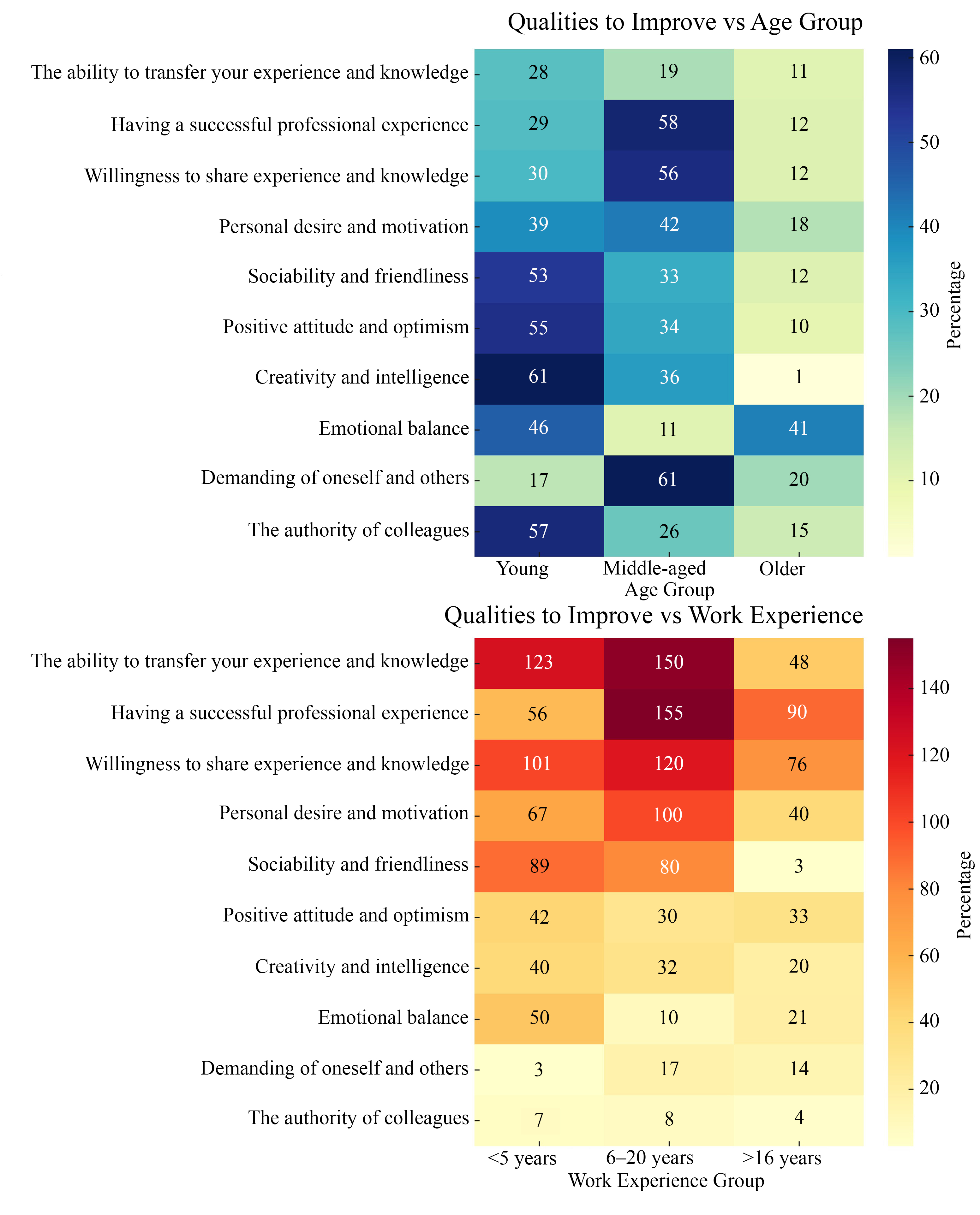 So, “Qualities to improve” strongly depends on “Age” and “Working years”.