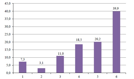 Организационная приверженность учителей. Рассмотрим ответы учителей на анкетные вопросы, связанные с организационной приверженностью. Респондентам необходимо было дать оценку следующему утверждению: «Если бы Вы могли вернуться в университетские дни и начать все сначала, стали бы учителем или нет?» по 6-балльной шкале, где 1 – однозначно не выбрал бы учительскую стезю, 6 – однозначно стал бы учителем. Распределение ответов по шкале представлено на рисунке.