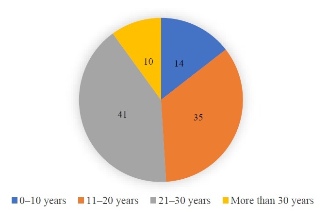 When the survey was carried out, professional teaching experience of the respondents at the level of post-secondary education varied from one to 48 years (Fig. 1).
