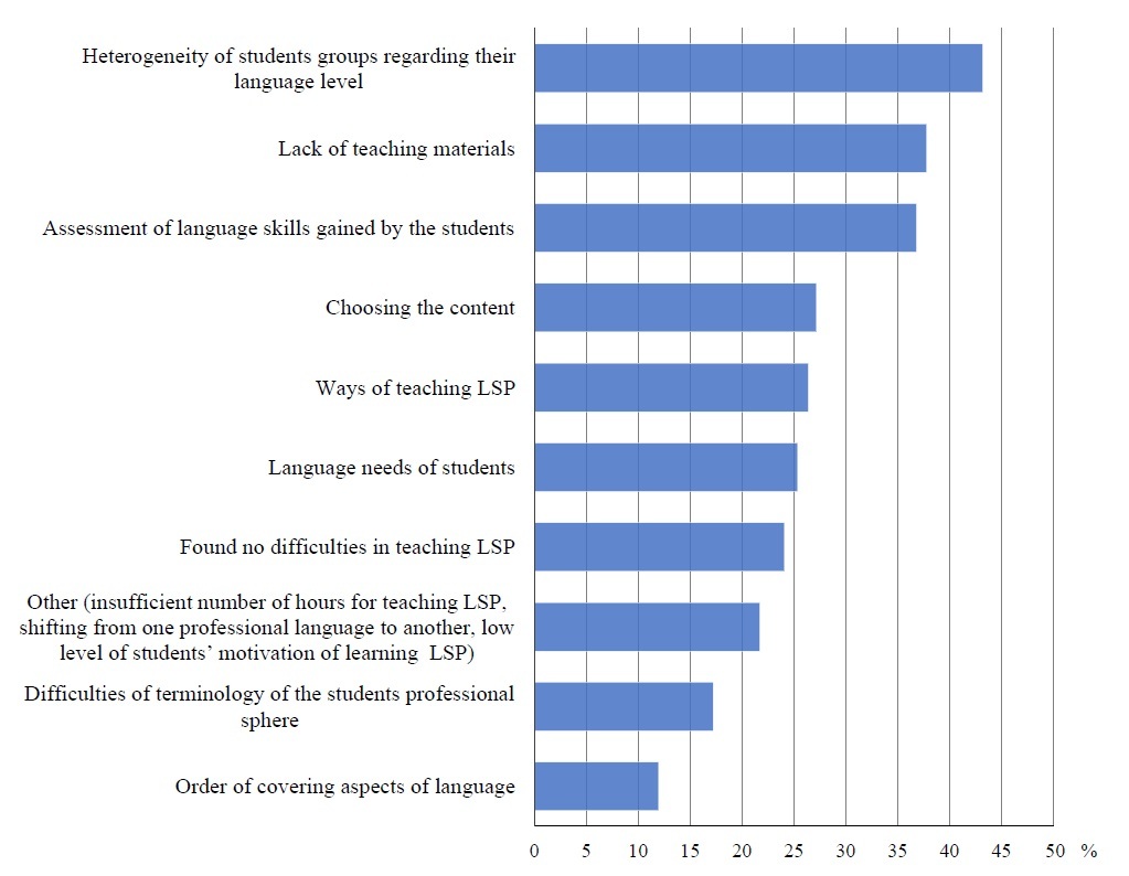 The analysis of the teachers’ responses allowed us to state that all troublesome issues were caused by a certain deficiency of methodological knowledge necessary to identify the best course content and approaches to teaching LSP.