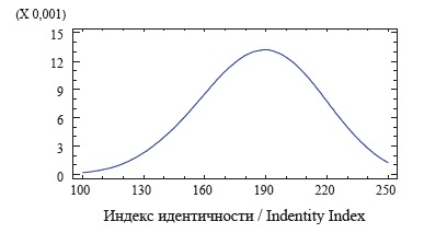 Характер кривой, отражающей распределение уровня сформированности гражданской идентичности подростков (индекс идентичности) на рисунке 4 смещается в сторону значений выше среднего. Среднее значение по шкале опросника соответствует 150 баллам, при этом в данной выборке среднее значение соответствует 187 баллам, со стандартным отклонением ± 24,6 балла. Респонденты в данном исследовании демонстрируют уровень сформированности гражданской идентичности выше среднего. Смещенность распределения в сторону высоких значений признака подтверждается также показателем асимметрии (–2,77358).