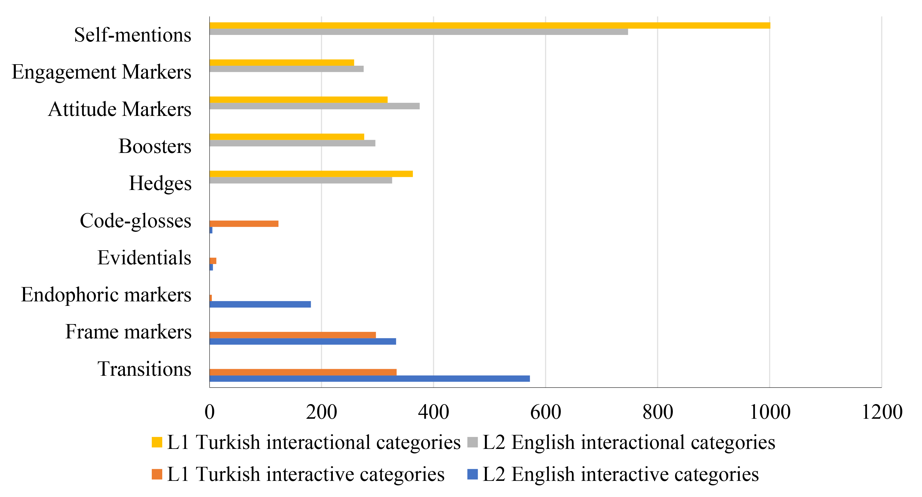 As depicted in Figure, transitions, frame markers, and code glosses were identified as the most commonly used interactive categories in both corpora, whereas endophoric markers and evidentials were less frequently employed. Similar tendencies were observed in the use of interactional markers across both L1 and L2 essays. Turkish students consistently employed self-mentions, hedges, and attitude markers more frequently than boosters and engagement markers. Notably, self-mentions were the most frequently used interactional markers in both languages, though slightly more so in Turkish (L1). In contrast, engagement markers appeared more often in English (L2), suggesting greater audience awareness when writing in English.
