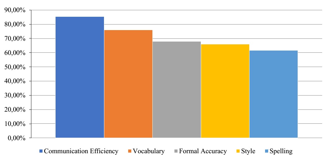The following graph shows the results of the evaluation of our studentsʼ written communications within the period 2015–2020 at the B2 CEFR level. Processing the outputs, we applied five criteria for an objective assessment of the formal and content aspects of the selected written communications. These are formal accuracy (0–5 points), spelling (0–5 points), vocabulary (0–5 points), style (0–5 points), and communication efficiency (0–5 points), where 25 is the maximum points. The highest points on the scale are for the communication efficiency and vocabulary range scoring criteria (figure). Then, it is for the morphosyntactic well-formedness of generated texts. Finally, fewer points are for pragmatic and sociolinguistic adequacy aimed at the usages of the devices in the text to maintain its cohesion. The most frequent errors are considered typographical errors, mainly related to spelling, punctuation and paragraphing.