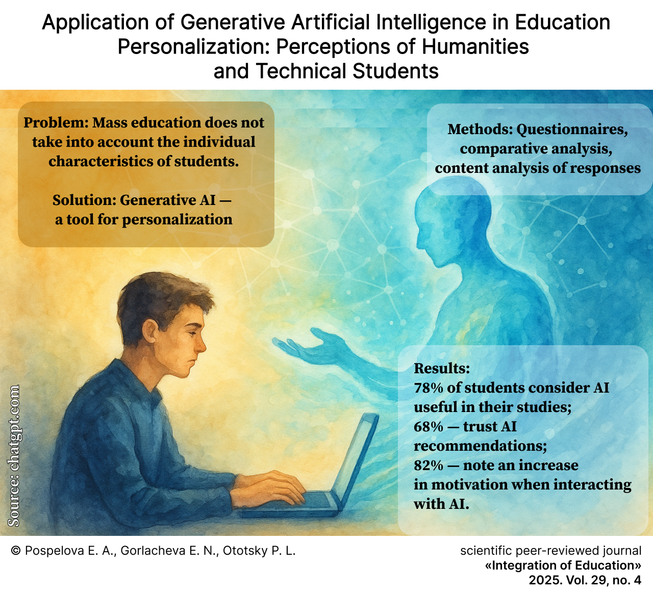 Introduction. The intensive integration of generative artificial intelligence technologies has led to significant transformations across various fields, including education. The expansive development of information technologies has enabled the simplification of education personalization, enhancing its quality, accessibility, and methodological diversity. The advantages of these new technologies compel the scientific community to seek effective methods and approaches for applying artificial intelligence in learning and to anticipate upcoming changes in the educational environment. The aim of this study is to examine the experience of humanities and technical students using chatbots and to analyze students’ perceptions of educational process personalization through artificial intelligence.