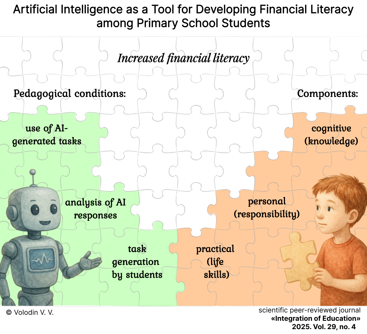 Results. Pedagogical conditions for the use of artificial intelligence have been developed, the implementation of which ensures the formation of cognitive, personal, and practical components of financial literacy in students. The use of tasks that enrich students’ knowledge of finances and financial and economic relations contributes to the development of skills in applying basic financial concepts in various life situations (cognitive component). The formation of responsibility for financial decisions is facilitated by students’ analysis of artificial intelligence outputs (personal component). Engaging primary school students in generating tasks using artificial intelligence stimulates their development of skills for making informed purchases and savings and for independent planning of ways to achieve financial goals (practical component).