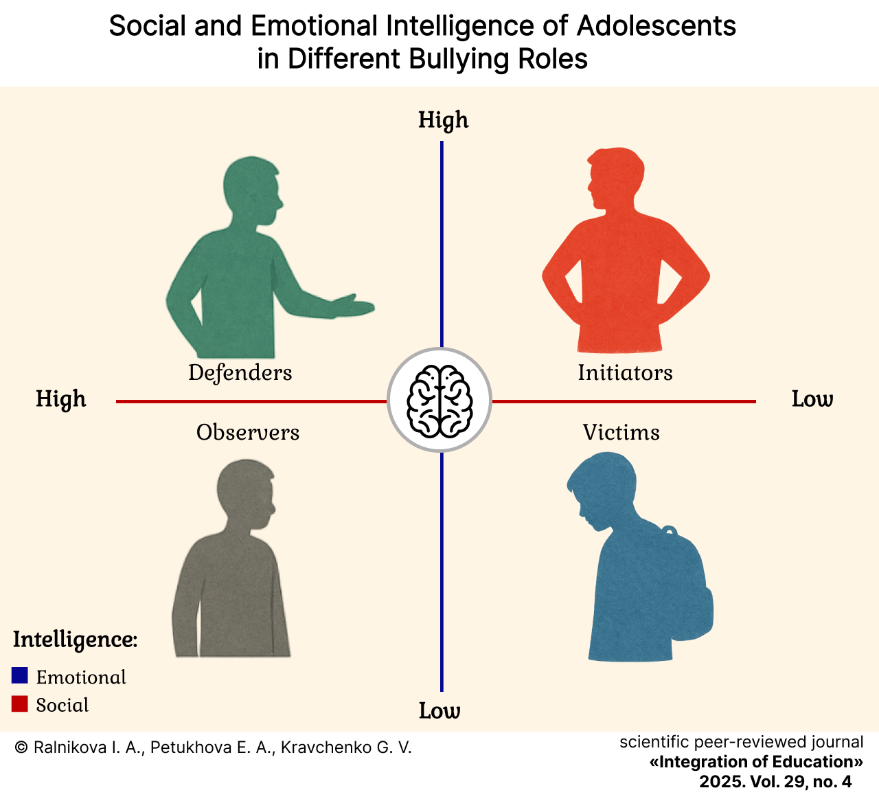 Introduction. School bullying significantly impacts the learning and upbringing processes of contemporary adolescents. The problem of school bullying has been extensively and substantively examined through the lens of educational psychology and pedagogical psychology. However, a systematic understanding of this issue from the perspective of the factors contributing to the emergence and functioning of bullying, and the study of social and emotional intelligence characteristics as factors influencing students’ involvement in bullying, remain relevant. The aim of the study is to investigate the characteristics of social and emotional intelligence in adolescents with different roles in the bullying process.