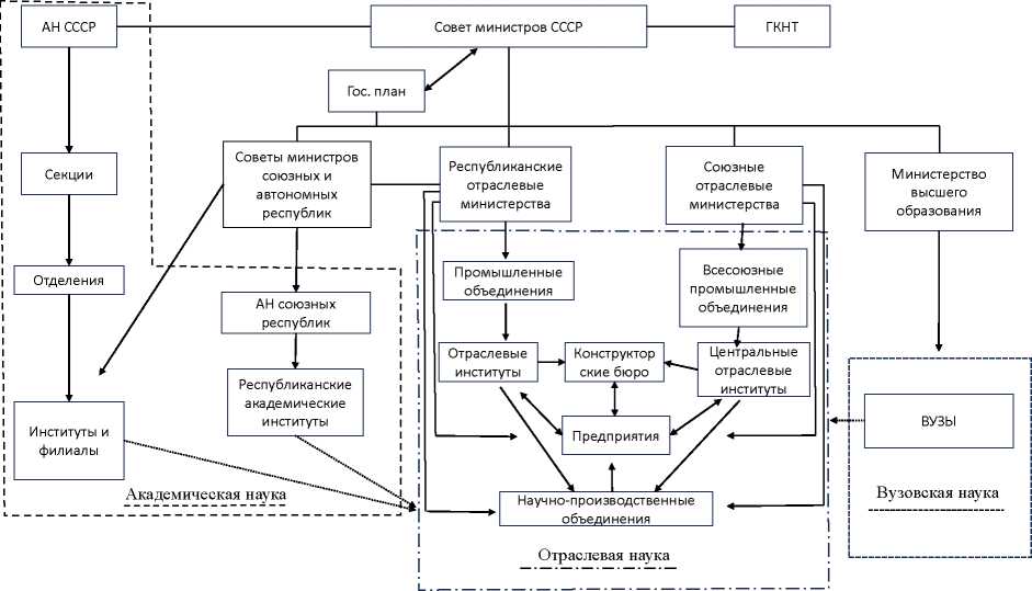 Таким образом сформировался территориально-отраслевой принцип управления наукой (схема). Подчинение осуществлялось как по вертикали (внутри отрасли), так и по горизонтали (местными властями). В советской историографии принято считать, что таким образом была сформирована система передачи знаний от науки в производство. Академические институты направляли научные результаты отраслевым, которые через проектные или конструкторские организации научные достижения преобразовывали в технические решения, внедряемые в производство. Параллельно вузовская наука, держа руку на пульсе, на опережение готовила специалистов под новые производства и технологии [5, с. 121, 127]. Фактически эта схема не работала. В конце 1980-х гг. это констатировал Г. А. Лахтин: «Академическая и отраслевая наука конкурировали между собой, при этом отраслевая наука выступала в качестве эксперта для результатов НИР академических учреждений. В результате институты АН СССР были вынуждены создавать дублирующие конструкторские бюро и опытные производства. В то же время производство не было заинтересовано в нововведениях, т. к. для них приоритетным было выполнение плана производства» [6, с. 40, 41].