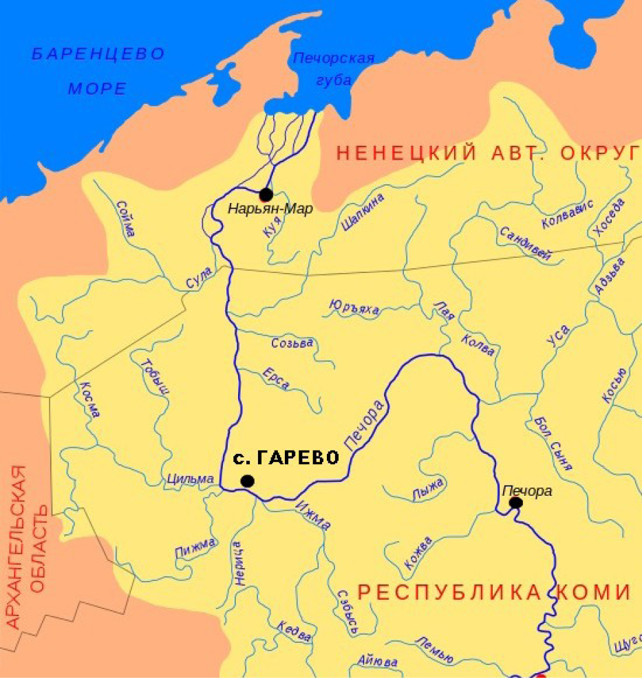 Рисунок. 1. Место находки костного фрагмента на реке Печоре.
