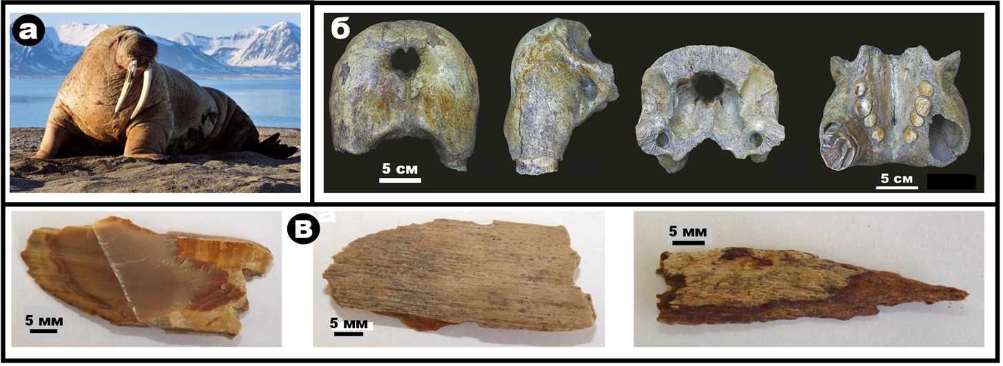 Рисунок 2. Внешний вид современного моржа (а), лицевой отдел черепа найденного на р. Печоре ископаемого моржа атлантического подвида (б) и фрагменты левого бивня, послужившие объектом исследований (в).