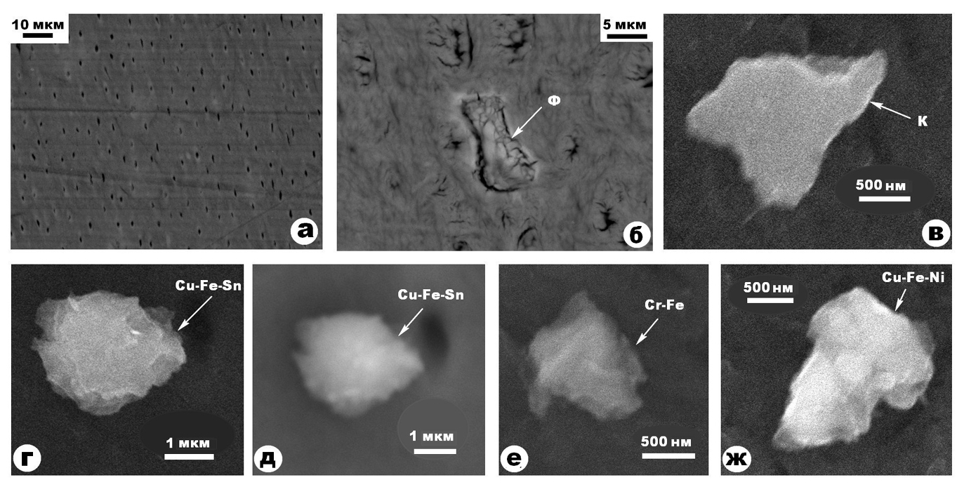 Рисунок 7. Биоапатит (а) и микроминеральные примеси в нем (б–ж). Микроминералы: Ф – Ca-Fe фосфат; К – кальцит; Cu-Fe-Sn – железистая бронза; Cr – самородный хром; Сu-Fe-Ni – никелево-железо-медный сплав. СЭМ-изображения в режимах вторичных (а, г) и упруго-отраженных (б, в, д–ж) электронов.