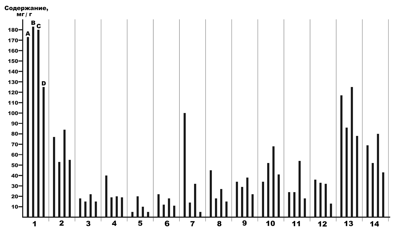 Рисунок 11. Пропорции между белковыми аминокислотами в коллагене печорского моржа (A), плейстоценовых лошадей со стоянки Заозерной (В), плейстоценовых млекопитающих со стоянки Ушбулак (С) и медведей из пещеры Иманай (D). По горизонтали – аминокислоты: 1 – глицин; 2 – аланин; 3 – валин; 4 – лейцин; 5 – изолейцин; 6 – фенилаланин; 7 – тирозин; 8 – лизин; 9 – аспарагиновая кислота; 10 – глутаминовая кислота; 11 – серин; 12 – треонин; 13 – гидроксипролин; 14 – пролин.