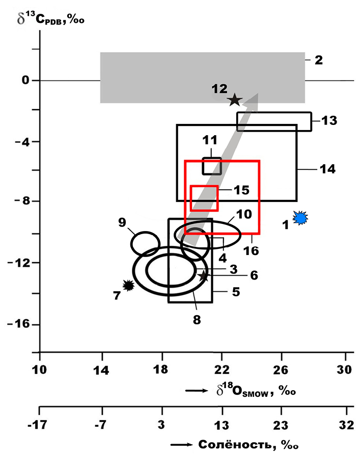 Рисунок 12. Изотопный состав биоапатита в ископаемых костях плейстоценовых млекопитающих на фоне морских карбонатных пород: 1 – бивень печорского моржа; 2 – карбонатолиты; 3 – мамонтовая фауна Западной Европы; 4 – мамонтовая фауна Печорского Приуралья; 5, 6 – соответственно мамонтовая фауна и неоплейстоценовый бурый медведь Омского Прииртышья (коллекция А.А. Бондарева); 7 – пещерная гиена с Южного Прибайкалья (образец от Д.В. Кобылкина); 8 – предголоценовые таймырские мамонты (образцы от Г.В. Шнейдера и Д.Н. Костина); 9 – плейстоценовые лошади со стоянки Заозерной; 10 – плейстоценовые млекопитающие со стоянки Ушбулак (Северо-Восточный Казахстан); 11, 12 – кости пещерного медведя с Печорского Приуралья с разной степенью кальцитизации; 13, 14 – соответственно пещерные львы и медведи Западной Европы; 15, 16 – костный детрит соответственно львов и малых медведей (Ursus «savini») из пещеры Иманай. Шкала солености воды построена по данным, вычисленным по уравнению В.Н. Кулешова. Стрелкой показан генеральный тренд изотопного утяжеления углерода и кислорода при переходе от ископаемых костей внепещерного захоронения к пещерным костным остаткам.