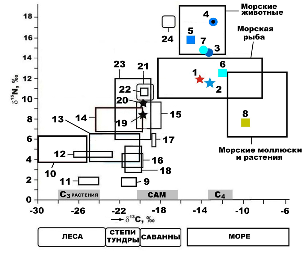 Рисунок 13. Изотопный состав костного коллагена, волос и кожи плейстоценовых и современных млекопитающих: 1 – бивень печорского моржа, определение в ИГ ФИЦ Коми НЦ УрО РАН; 2 – то же, определение в Гронингенском университете; 3–8 – зубы современных морских животных [10, 11], соответственно морж, касатка, гренландский тюлень, карликовый кашалот, дельфин-афалина, морская корова; 9 – плейстоценовые лошади со стоянки Заозерной; 10 – плейстоценовые млекопитающие со стоянки Ушбулак; 11 – носорог шерстистый; 12 – современные таежные бурые медведи (волосы и кожа); 13, 14 – соответственно медведи и львы из пещеры Иманай; 15, 16 и 17, 18 – соответственно до-LGM и пост-LGM популяции пещерных львов и медведей Западной Европы; 19–21 – соответственно ископаемые пещерная гиена, волк и росомаха с Западной Европы; 22 – ископаемая пещерная гиена с Южного Прибайкалья; 23 – современные бурые камчатские медведи (волосы и кожа); 24 – современные белые медведи с о. Вайгач (волосы и кожа). Шкала континентальных ландшафтов показана по Г. Бошрену и Д. Дракеру.