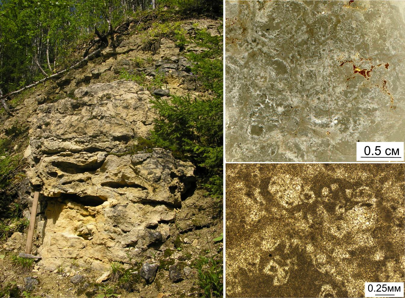 Рисунок 3. Выходы доломитов верхнего девона на левом берегу р. Черь Ижемской (обн. 10): а – скальный с кавернами на поверхности; б, в – вторичные с тонкокристаллической (более светлое) и пелитоморфной (более темное) структурами.