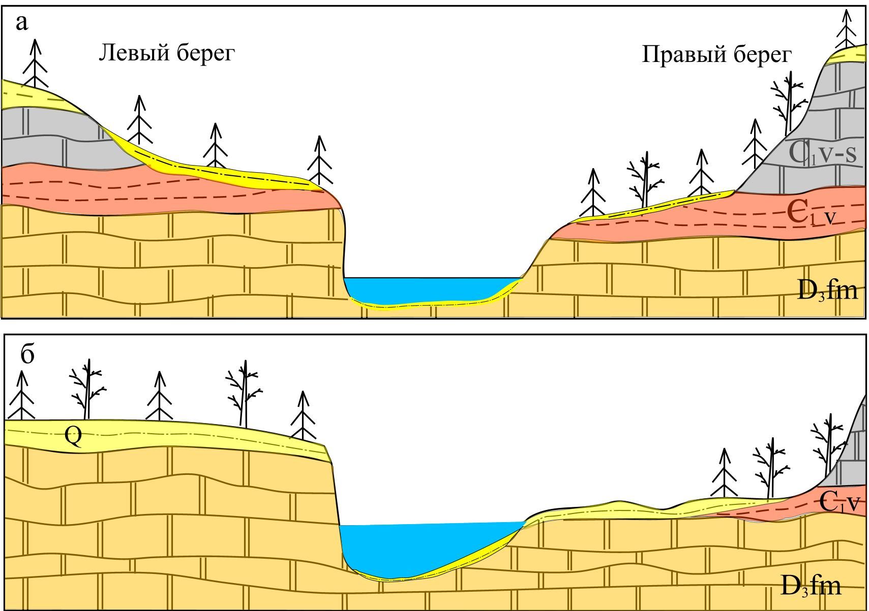 Рисунок 4. Схема некоторых поперечных форм долины р. Черь Ижемской и распространение нижневизейской каолинитовой толщи: а – «бронирование» каолиновой толщи визейскими доломитами; б – визейские доломиты удалены от русла реки, глинистая толща размыта.